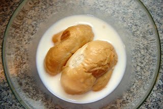 2. Egy másik tálba öntsünk 3 dl tejet, áztassuk meg benne egyenként a zsemléket, nyomkodjuk ki belőlük a tejet, úgy, hogy teljesen szétessenek apró darabokra. Ne maradjon szikkadt, kemény rész benne. Tegyük a húsra.