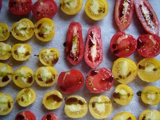 A paradicsomokat félbe vágjuk, sütőpapírral borított tepsire rakosgatjuk, majd megszórjuk a cukorral, őrölt borssal, megcsepegtetjük az ecettel és az olajjal, és 150 fokos sütőben 2 és fél órán át szárítjuk. Nem veszítik el teljesen a nedvességtartalmukat, de ez nem is baj: az pont jól jön a kölesnek.