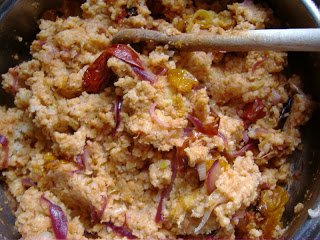 Négy: Kevés olajon (2 ek napraforgó vagy olíva) dinsztelni kezdjük a hagymákat. Amikor jól átpárolódott, hozzákeverjük a kölest és a paradicsomot.