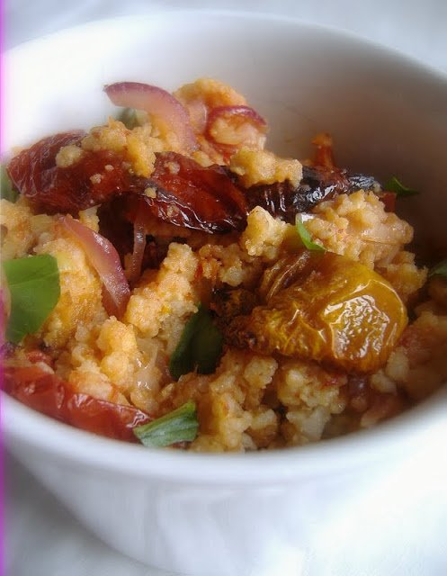Tegnap a piacon jártam, és egy nénitől különböző formájú és színű paradicsomokat vettem. Egyik közös jellemzőjük, hogy igazi, napérlelte paradicsom ízük van – ezért is gondoltam, hogy ebből valami nagyon klassz ebédet kéne készíteni. Aztán, amikor megláttam a paradicsomszárítós receptet, már tudtam is, hogy mi lesz belőle: összehozom a kölessel.