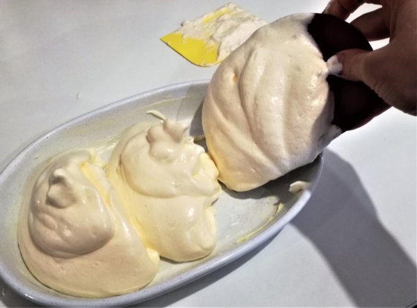 - Habkártya segítségével három “hegyet” teszünk egymás mellé az ovális formába, és mehet a tál a sütőbe.