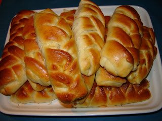 Szóval, ennek a szép fonott, kalácsnak látszó tárgynak az alapötletét Fűszeres Eszternél láttam, ő a tésztát sárgabarackkal töltötte; én átformáltam sós, töltött batyuvá.