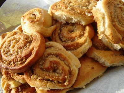 A csiga vonalát folytatva: kinyújtom, megszórom tejben felfőzött, ízlés szerint cukrozott dióval, feltekerem, majd 1 cm vastag csigákat vágok a hengerből. Egymástól 2-3 cm-re teszem őket egy sütőlapra, majd fél órát hagyom kelni. Amikor akkorák, hogy összeérnek, bekapcsolom a sütőt 180 fokra, és betolom a tepsiket. Nem vagyok benne biztos, de mintha 20-25 perc alatt sülnének pirosra…