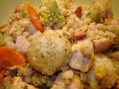 Közben megtisztítom és felaprítom a többi zöldséget; a pagoda karfiolt rózsáira szedem, a répát karikákra vágom, a fokhagymát összenyomom (vagy szét?). A karfiol kivételével (ezt majd egy jó 10 perccel később, hogy ne főjön szét) mindezt az enyhén megpirult húshoz adom, teszek hozzá öt marék hántolt árpát, és felöntöm annyi vízzel, hogy jócskán ellepje. Sózom, borsozom, hozzáadom a bógrízt is, majd lefedve párolom. És addig elkészítem a gombócot.
