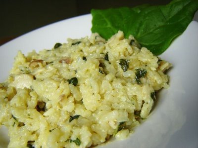 Az apróra vágott hagymát olívaolajon üvegesre pároltam, majd rádobtam a gombát. Pár perc múlva utánaküldtem az összevágott spenótot, az összenyomott fokgymaagerezdeket, majd fél kiló rizst (nem szabad megmosni!). Jól átkevertem, és felöntöttem a fehérborral, amit hagytam is elpárologni. Utána felöntöttem annyi zöldséglével, amennyi ellepte, és főztem, kevergettem. Mindig csak ennyi folyadékot öntöttem rá, addig, amíg meg nem puhult a rizs (20-25 perc). A végén belekevertem a parmezánt, kicsit utánasóztam, és borsoztam.