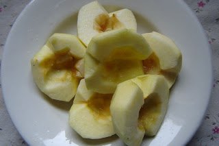 Az almákat meghámoztam, csutkájukat eltávolítottam, és megcsepegtettem citromlével.