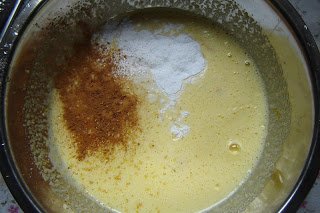 Hozzáadtam a joghurtot, a sütőport, a citromhéjat és -levet, a fahéjat, a sót, és ezt is összekevertem.