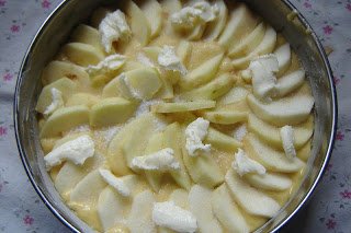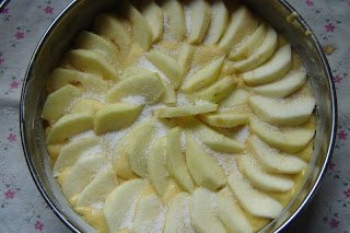 Az almás masszát a kivajazott, kilisztezett formába öntöttem (lehet kapcsosba, de akkor tegyünk bele sütőpapírt, hogy ne folyjon ki az összeillesztésnél). Felszeltem a maradék négy fél almát, és körberaktam vele a tésztát.
