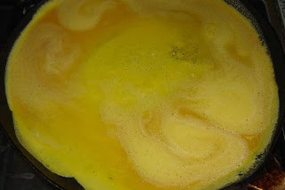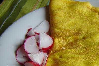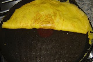 Felverjük a két tojást (két csipet sóval), majd egy teflonos serpenyőbe, vagy palacsintasütőbe öntjük, és úgy sütjük meg nem túl nagy lángon, hogy közben nem kevergetjük. Így szépen egyben marad.