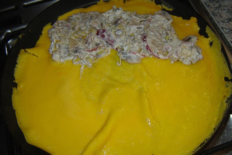 Amikor már a teteje is megdermedt, az egyik felén szépen eligazgatjuk a kívánt mennyiségű tölteléket (attól függően, végül hányfelé kell elosztanunk), megszórhatjuk sajttal is akár, és egy falapát segítségével ráhajtjuk a másik felét.