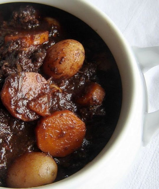 Először is felcsíkozzuk a szalonnát; elővesszük a kuktát, és egy evőkanál olajon elkezdjük kiolvasztani a zsírt a csíkokból. Közben a két hagymát negyedekbe vágjuk, és felszeleteljük; amikor a szalonna már pirul, rádobjuk a hagymát. Miközben a hagyma is egy kis színt kap, felkockázhatjuk a marhát, ha még eddig nem tettük meg. Ha ez is megvan, kimerjük a hagymás szalonnát a kuktából, és a visszamaradt zsíron, megkapatjuk a húskockák minden oldalát. A végén hozzáadunk egy evőkanál lisztet, ezzel is pirítjuk kicsit a húst. Amikor már úgy gondoljuk, jó, visszamerjük a húsra a szalonnás hagymát, rátesszük a paradicsompürét, elkeverjük, és felöntjük kb. 6 dl finom vörösborral, és 4 dl vízzel. Sózzuk, borsozzuk, lefedjük a kuktát, és forrás után nagyjából 40 percig hagyjuk pöszörögni.
