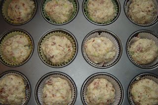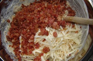 Egy tálban összekevertem a lisztet a sütőporral, hozzáadtam a zsírt, majd a tojást, a tejfölt, a szalonnát, az apróra vágott újhagymát és a nagylyukú reszelőn lereszelt sajtot. Adtam hozzá egy kevés sót, de tényleg csak keveset. Meg egy kis borsot őröltem bele.