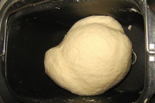 A hozzávalókat ilyen sorrendben a kenyérsütő üstjébe tettem; amikor a savóba morzsoltam az élesztőt, pár percet vártam, amíg felhabosodott kissé. Amikor mindent beletettem, elindítottam a gépet, és 20 perc alatt összedagasztattam a tésztát. A képen látszik, hogy szépen gömbölyödik; ha túl lágy, liszt kell még hozzá, ha túl kemény, tejföl vagy tej.
