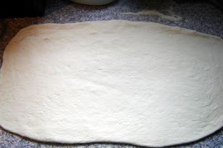 A megkelt tésztát kicsit átgyúrtam, újabb tíz percig állni hagytam, majd kinyújtottam ilyen jó széles téglalappá.