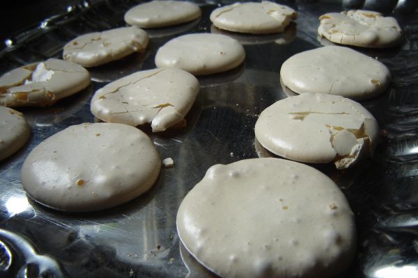 Érdekes, hogy a hab van, amikor egész kemény lesz, van, amikor viszonylag folyós. Most például sehogy sem akart igazán kemény lenni. De nem baj, azért a sütőpapírral leterített tepsibe 6-7 cm átmérőjű köröket kentem a masszából, majd betoltam a sütőbe, és AZONNAL levettem a hőt 130 fokra. Kb. 50 perc alatt szépen megsültek, úgy, hogy egészen fehérek maradtak. A következő tepsit küldtem a sütőbe az újabb adaggal.