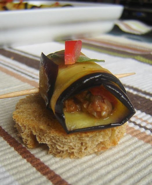 Minden padlizsánszeletre teszünk egy kiskanálnyi tölteléket, majd feltekerjük, és fogpiszkálóval összetűzzük. Vagy nem.
