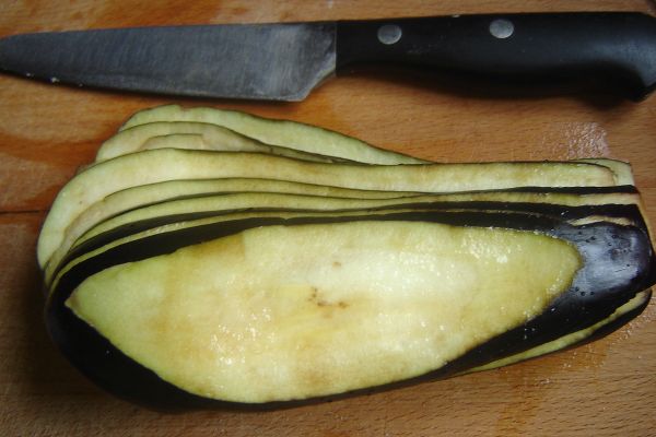 A padlizsánokat hosszában vékony szeletekre vágjuk, a szeleteket besózzuk – az alsónak mindkét oldalát, majd ahogy rátesszük a többit, mindegyiknek csak a felső felére hintünk sót.