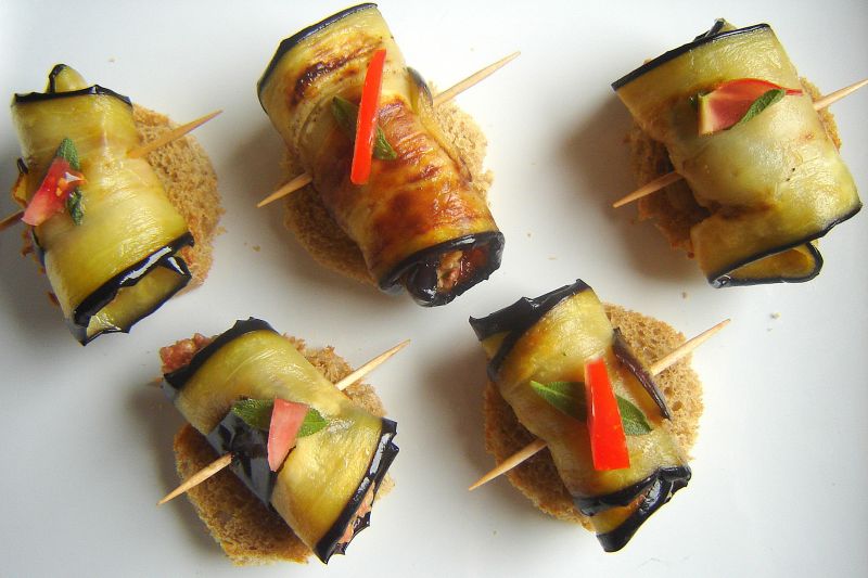 Minden padlizsánszeletre teszünk egy kiskanálnyi tölteléket, majd feltekerjük, és fogpiszkálóval összetűzzük. Vagy nem.