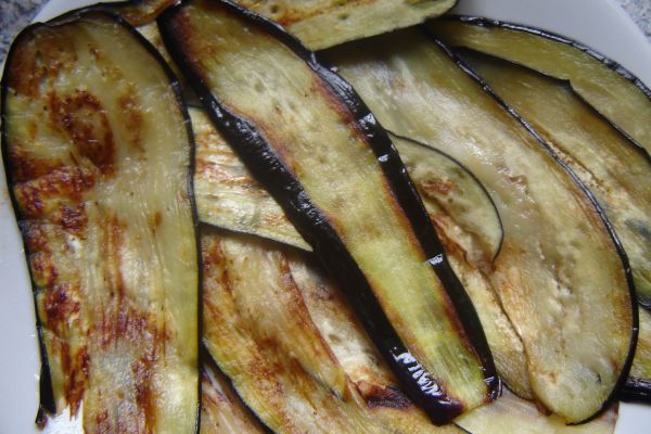 Egy serpenyőben kevés olajat (3 ek) forrósítunk, majd a padlizsánszeletek mindkét oldalát megsütjük benne. Az olajat időnként pótolni kell.