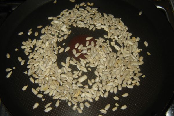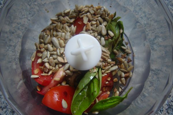 Egy száraz serpenyőben pár perc alatt megpirítjuk a napraforgómagokat. A serpenyőben ezután nagyon kevés (1 dkg) vajat hevítünk, és a zsályaleveleket 1 perc alatt átsütjük kissé.Aprítógépbe tesszük a bazsalikom- és zsályaleveleket, a pirított napraforgómagot, a paradicsomokat elnegyedelve, a fokhagymagerezdeket, a szardellafilét, az olajbogyókat, a balzsamecetet (vagyis a padlizsánon kívüli összes többi hozzávalót), és pépes keveréket készítünk. Nem kell, hogy homogén legyen, maradjon kicsit darabos.