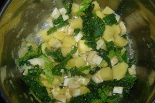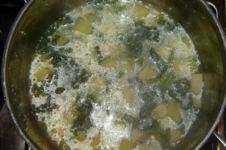 A hagymát felaprítjuk, kevés olajon dinsztelni kezdjük. Közben megtisztítjuk, és kis kockákra vágjuk a zellert és a krumplikat. Amint készen vagyunk, a hagymához adjuk, átkeverjük. Megmossuk a kelleveleket, kivágjuk a vastag ereket belőlük, és felcsíkozzuk. Mehet az edénybe. A két gerezd fokhagymát is a többi után küldjük, majd felöntjük annyi vízzel a zöldségeket, amennyi ellepi.