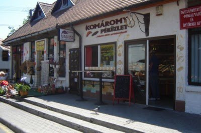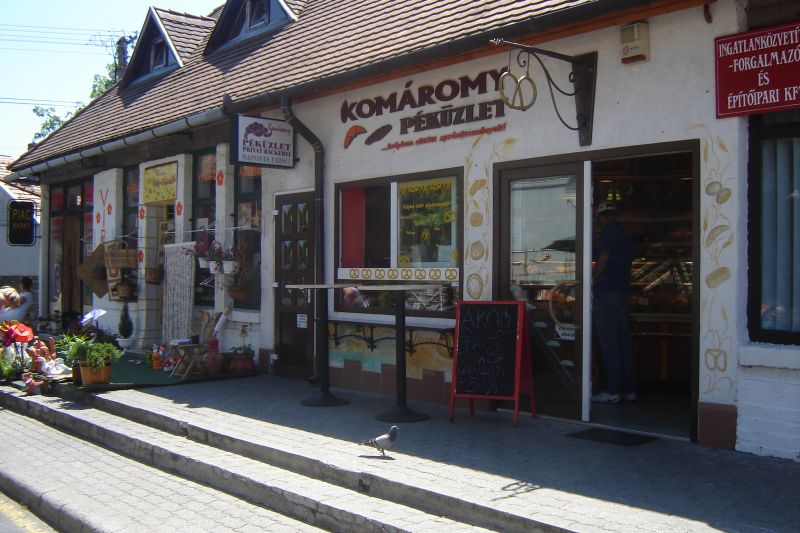 A piac alsó bejáratához érve (Arany János utca) jobb oldalon, az üzletsorba ágyazva találjuk a Komáromy pékség üzletét. Ha nyaraló lennék, reggelenként ide zarándokolnék friss pékáruért.
