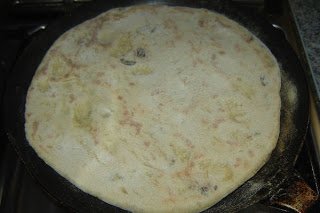 Utána lisztezett gyúrólapra borítottam, átgyúrtam, öt egyenlő részre osztottam. Ezeket gombócokká formáltam, és kb. húsz percig kelni hagytam.A gombócokat kinyújtottam, majd száraz teflonserpenyőben kb. öt perc alatt mindkét oldalukat megsütöttem.