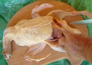 A comboknál ejtett két vágást, majd óvatosan, hogy a belső szervek közül ne vágjon szét semmit, szabaddá tette a bejárást a hasüregbe. Akkor benyúlt, megfogta a nyelőcsövet, behúzta a hasüregbe, majd az egész hóbelevancot – nyelőcső, begy, zúza, szív, máj, epehólyag, belek – kiszedte egy csomóban. Aztán szétválogatta. A belek mentek a kukába, a májról óvatosan leválasztotta az epehólyagot, azt is kidobta, aztán bevágta a zúzát nagyjából a feléig, kifordította, és a belsejéről lehúzta a kemény, redős, gumiszerű, enyhén zöldes borítást. A további tisztítás során mi még levágtuk a nyak végét, aztán a nyakat magát, meg a lábakat az ízületeknél, illetve a bőrt megpörköltük láng felett, hogy az apró szöszök eltűnjenek róla.