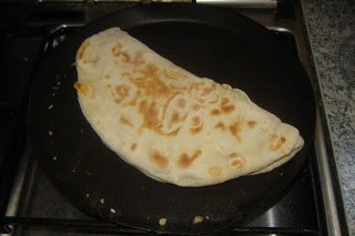 És ha a töltéssel megvagyunk, a kenyeret félbehajtjuk, és a serpenyőt visszatesszük a tűz fölé.