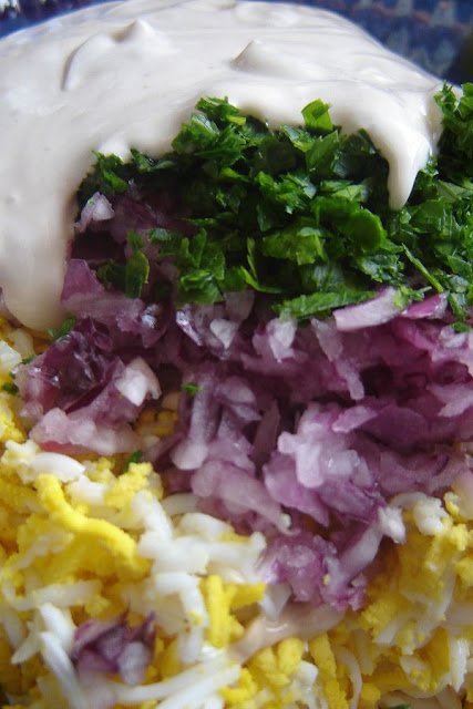 A tojásokat megfőzzük – biztos ami biztos alapon 8 percig hagyjuk forrni. Ha egyből leöntjük róluk a forrót, és intenzíven cserélgetjük rajtuk a hideg vizet, akkor könnyen lejön majd a héjuk. A lényeg, hogy hirtelen hűtsük le a tojásokat. Hámozás után reszeljük le valamennyit, majd aprítsuk fel a hagymát, a petrezselymet, keverjük össze a tejfölt az ízesítőkkel.
