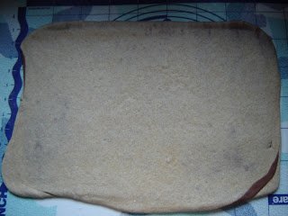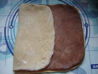 Amikor a tészták megkeltek, a fehéret szép, viszonylag szabályos téglalappá nyújtottam. Jó vékonyra.Gondolatban 3 részre osztottam, és a kakaós tésztalapot 2/3-nyira nyújtottam.