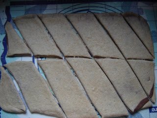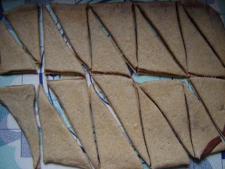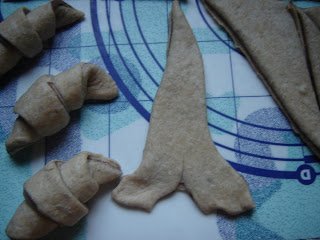 A háromszögeket kiflikké csavartam úgy, hogy a képen látható módon a rövid oldalt bevágtam. Ezt a megoldást Limaránál láttam, nagyon jó ötlet, mert így szebbek lesznek a kiflik.