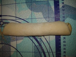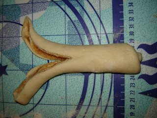 Pizzavágóval bevágtam a közepéig, és a két felet lehajtottam teljesen a henger aljáig. Itt követtem el az eltérést az eredeti “how to”-tól, mert a “banán” másik végét nem vágtam be.