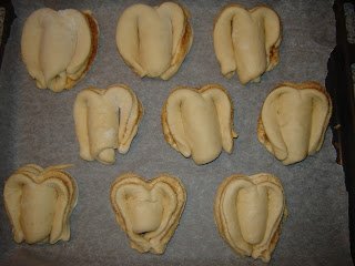 Szerintem így azért jobban hasonlít egy félig elfogyasztott banánra… Nos, amikor elkészültek, sütőpapírral borított tepsire tettem őket, 50 fokos sütőben kelesztettem még 15 percig, majd lekentem tojással, és 200 fokon újabb 15 perc alatt megsütöttem.