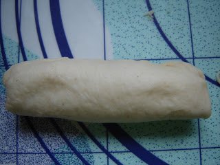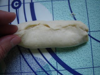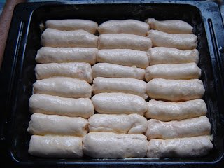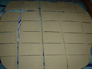 A duplájára kelt tésztát kicsit átgyúrtam, újabb tíz percig pihenni hagytam, hogy aztán könnyebben ki tudjam nyújtani. Jó vékonyra nyújtottam, majd kb. 7×10 cm-es téglalapokra vágtam. Az a tapasztalatom ugyanis, hogy a tészta úgyis rögtön kelni kezd, ezért töltéskor az ujjaimmal mindig el kell egy kicsit lapítani. A szélső, túl kicsire sikerült darabokat újra összegyúrtam, majd később azt is kinyújtottam újra.