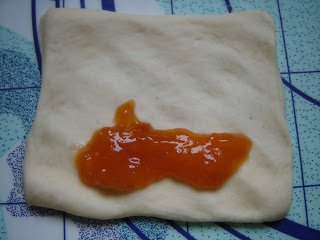 Itt látható, hogy az ujjaimmal megnyomkodtam a téglalapot, így majdnem négyzet lett. Az alsó szélén elhelyezem a tölteléket, ami nem törvényszerűen lekvár, lehet mazsolás túró vagy csoki, mondjuk.