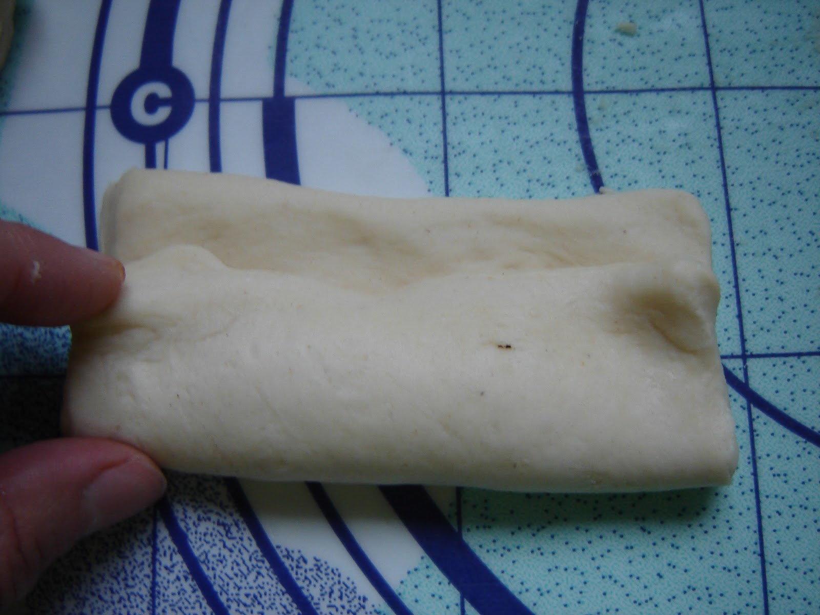 A duplájára kelt tésztát kicsit átgyúrtam, újabb tíz percig pihenni hagytam, hogy aztán könnyebben ki tudjam nyújtani. Jó vékonyra nyújtottam, majd kb. 7×10 cm-es téglalapokra vágtam. Az a tapasztalatom ugyanis, hogy a tészta úgyis rögtön kelni kezd, ezért töltéskor az ujjaimmal mindig el kell egy kicsit lapítani. A szélső, túl kicsire sikerült darabokat újra összegyúrtam, majd később azt is kinyújtottam újra.