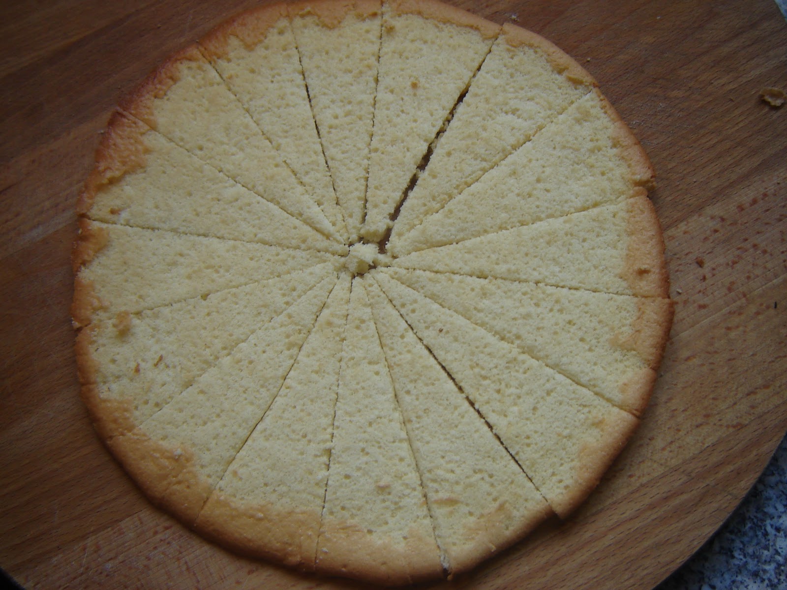 Hmmm… a legszebb piskótakört – elveimmel ellentétben – éjszakára folpackba csomagoltam (úgy értem, a folpack van az elveim ellen). Amikor reggel leszedtem a fóliát a tésztáról, az szépen húzta magával a piskóta “bőrét”… ahogy kell, persze, foltosan, nem egészben. Úgyhogy a fent látható módon megnyúztam az egészet, nehogy elcsúfítsa nekem a tetőt.