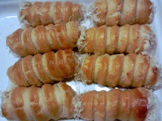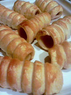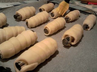 Kezünkbe vesszük az egyik formát, és a szélesebb végénél kezdve rátekerünk egy tésztacsíkot úgy, hogy fél centi szélességben mindig fedje az előzőleg rátekert darabot. Sütőpapírral borított tepsire rakjuk a rollnikat úgy, hogy a tésztavégek mindig alulra kerüljenek. Lekenjük őket felvert tojással, és 17 perc alatt megsütjük.