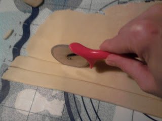 Nyújtsuk ki a tésztát úgy, hogy a hossza kb. 50 cm legyen – ehhez képest alakítsuk a szélességét – a tészta vastagsága pedig kb. 2 mm. Pizzavágóval, vagy éles késsel vágjuk fel 1,5 cm széles (és 50 cm hosszú) csíkokra.