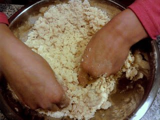Tegyük egy tálba a vajat, a lisztet és a sót, és az ujjhegyeinkkel, illetve a két tenyerünk között dolgozzuk össze.