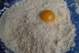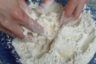 A lisztet összekeverjük a többi száraz anyaggal: a porcukorral, a sóval, a sütőporral, a citromhéjjal, majd eldolgozzuk a vajjal. (Citromhéj: mivel nem találtam kezeletlen héjú citromot, vettem egy csomag Kotányi reszelt citromhéjat – annak aztán nem sok íze van…de legalább nem mérgezem vele a családot.)