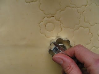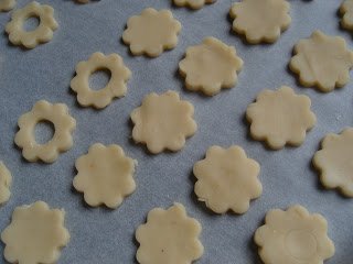 Az egy óra elteltével a sütőt előmelegítjük 180 fokra. Elővesszük a tésztát a hűtőből, lisztezett gyúrólapon kb. 3 mm vékonyra kinyújtjuk. Ezután jön a játék: ugyanannyi lyukas és lyuk nélküli tésztát szaggatunk, a maradék darabokat mindig összegyúrjuk, újra kiszaggatjuk. A munka ezen részét a gyerekek is szívesen végzik.