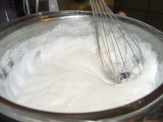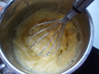 Egy kis tejforraló lábasban kezdjük el melegíteni a tejet. Egy kis tálban (amibe a két tojássárgát tettük) keverjük össze a sárgákat 10 dkg cukorral, a vaníliás cukorral (vaníliával) és az étkezési keményítővel (kevés tejet adhatunk hozzá). Amikor a tej már majdnem forr, adjuk hozzá a tojássárgás-cukros-keményítőt, és addig keverjük habverővel, amíg jó sűrű nem lesz. Ekkor zárjuk el alatta a lángot, és vegyítsük össze a tojásfehérje habbal. Tegyük félre, hadd hűljön.