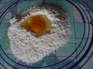Gyúródeszkán/lapon gyúrjuk össze a lisztet az egész tojással, és a félretett sárgájával, fél kk sóval, és 3-4 ek tejjel. Óvatosan adagoljuk a tejet, nehogy túl lágy tésztát kapjunk, elég keménynek kell lennie. Ha megvan, szedjük szét négy kisebb gombócba.
