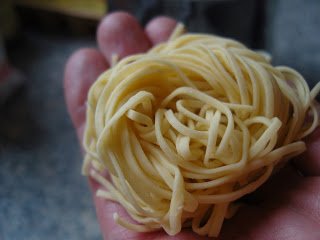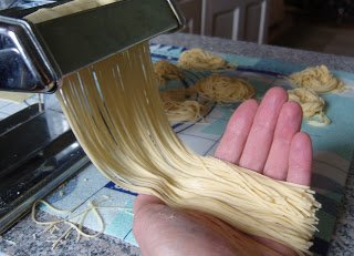 Ez a recept kimondottan azoknak való, akiknek a) van tésztakészítő gépük, vagy b) nagy gyakorlatuk van a kézi cérnametélt gyártásban. Bevallom, én gép nélkül neki sem álltam volna, mert nem tudom sodrófával ezt a kemény gyúrt tésztát szép egyenletesen vékonyra nyújtani, illetve késsel nem tudom egyforma csíkokra vágni. De tudom, vannak, akiknek ez nem probléma.