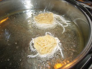 A hosszú lapot kb. 25 centis darabokra vágjuk, és ezeket a cérnametélt-készítőn hajtjuk át. Egy ilyen lapból készült metélt-köteget kettéveszünk, és két kisebb “fészket” tekerünk belőle (a képen hátul látható).
