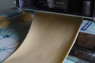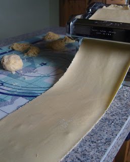 A tésztakészítő gépen megdolgozzuk a gombócokat: háromszor-négyszer átengedjük a sima hengerek között, a legnagyobb (legvastagabb) fokozaton úgy, hogy közben újra összehajtogatjuk. (Tulajdonképpen a gyúrást folytatjuk, de most a gépre bízzuk a nehezét.)
