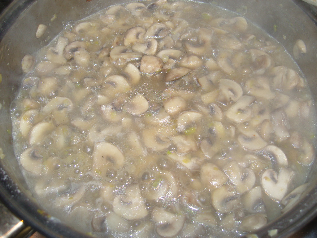 Amikor a gomba kieresztette a levét, és nagyjából el is főtte, megszórjuk a liszttel, átpirítjuk, majd hozzáadjuk a bort, és pár perccel később még két deci vizet vagy húslét, ha éppen van kéznél. Én karfiolkrémlevest főztem éppen, és a karfiol szárított zöldségekkel ízesített levéből mertem a gombához.