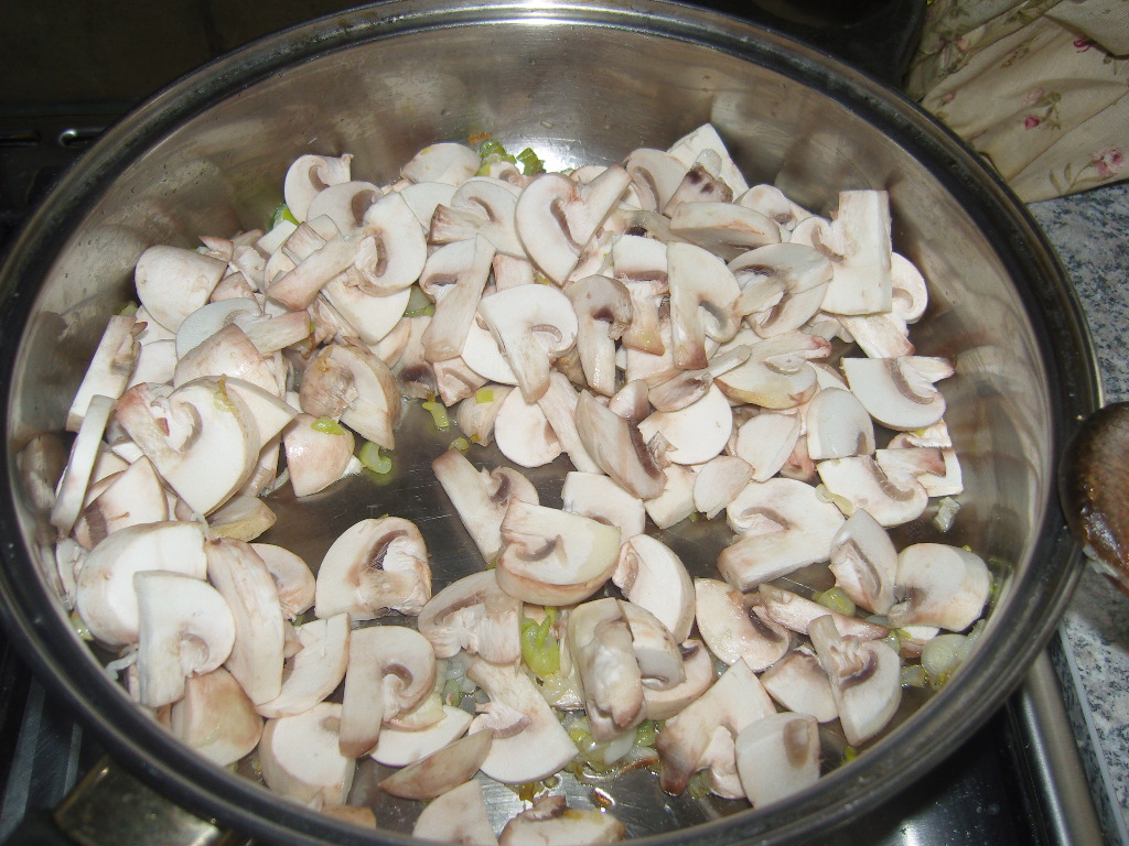 A serpenyőből leöntjük az olaj jórészét, ahol esetleg megégett, papírtörlővel töröljük ki. A hússütésből visszamaradt pörzsanyagok külön jót fognak tenni a mártásunknak. Az újhagymákat felszeleteljük, és a kevés olajon párolni kezdjük, közben megmossuk és felszeleteljük a gombát, ezt is hozzáadjuk.